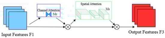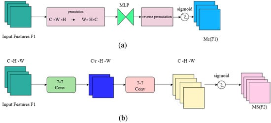 The channel attention submodule uses 3D arrangement to preserve cross-dimensional information. Then, a Multi-Layer Perceptron (MLP) is used to amplify the cross-dimensional channel–space dependencies. The MLP follows an encoder–decoder structure, similar to BAM, with a reduction ratio of r. In the spatial attention submodule, two convolutional layers are used to fuse spatial information, and the same reduction ratio r, as in BAM, is applied to reduce the spatial information [