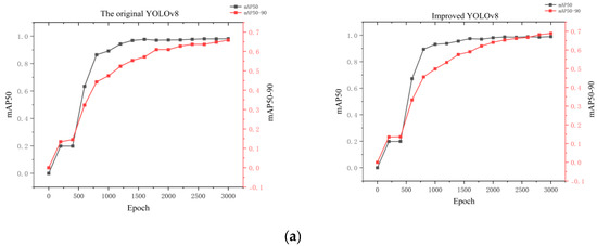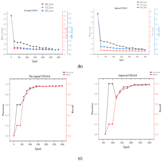 In the early stages of training, we used the imaging functionality of the Basler industrial camera (Ahrensburg, Germany) to capture 1000 images of droplets distributed across different small electrode positions. The collected data were then divided into four parts for the training set and one part for the prediction set. The images in the training set were labeled, with the target objects to be identified extracted. In the captured images, a rectangular grid was drawn around the electrodes of the digital microfluidic chip, and labels were assigned to the droplets and the four corners of the rectangular grid. The improved YOLOv8 object detection model was then trained using this labeled training set. We use the Dell G15 produced in the United States. The GPU used for training was an RTX 3060, with an AMD Ryzen7 6800 CPU and 16 GB of RAM. The experiments were conducted on a Windows system using the PyTorch framework and Python version 3.10, with the model trained for 3000 epochs, taking 6 h to complete. To better highlight the superiority of the improvements made to the model, we trained the same training set under identical conditions using the original YOLOv8 object detection model, with the results shown in