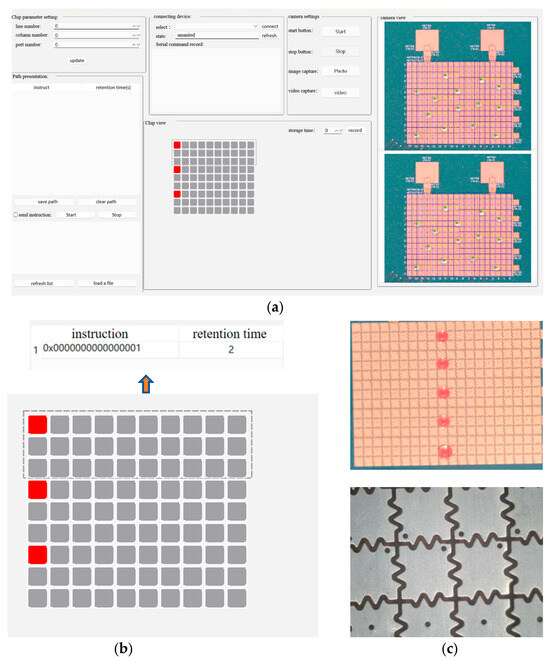 Using the designed digital microfluidic chip with multiple sets of droplets moving in parallel equipped with a Basler industrial camera for real-time image acquisition, high-throughput droplet operations and real-time accurate monitoring can be achieved. Additionally, to facilitate the control and feedback of droplet movement trajectories, a host software interface was designed to perform complex functions for multi-droplet operations. This software allows users to input specific rows, columns, and channel numbers, which are then displayed on the chip view. For example, when inputting a chip size of three rows, ten columns, and three channels, a 9 × 10 electrode array will appear, and the designated rows and columns for the channel number will be highlighted. When clicking on a specific single electrode, all parallel electrodes corresponding to it will be highlighted in red. Users can then set the voltage hold time and record the path for future droplet movement trajectory planning, as shown in