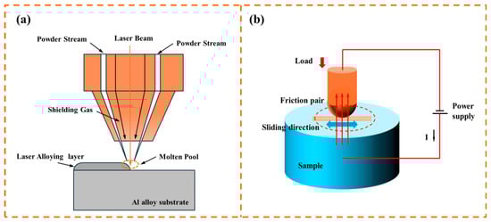 Schematic diagram of (a) the laser alloying process and (b) current-carrying wear.