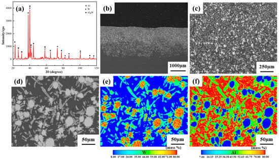 Further microstructural characterization is provided by SEM images and EPMA mappings, as shown in Figure 2b–f. The SEM images in Figure 2b,c demonstrate a uniform distribution of W and Al4W phases within the Al/W composite layer. In addition, the composite layer exhibits metallurgical bonding with the aluminum alloy substrate, indicating a strong bond between the layer and the aluminum alloy substrate. According to the EPMA results illustrated in Figure 2e,f, it can be inferred that the white block structures correspond to W phases, and the light gray structures represent Al4W phases. These findings are consistent with our previous research [].