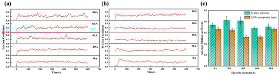 Figure 3a,b show the friction coefficient curves of both the aluminum alloy substrate and the Al/W composite layer under different currents. It can be observed that the friction coefficient curves of both materials display slight fluctuations in the absence of current. However, current applications induced progressive destabilization. Notably, the amplitude of fluctuations was substantially more pronounced in the aluminum alloy substrate compared to the Al/W composite layer, demonstrating the enhanced interfacial stability achieved through tungsten reinforcement.