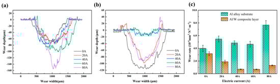 Cross-sectional profiles of the wear scars of (a) the aluminum alloy substrate, (b) the Al/W composite layer, and (c) the wear rate under different currents.