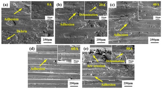 Figure 5 illustrates the morphology of the wear surface of the aluminum alloy substrate under different currents. Under current-free conditions (0 A), the wear surface exhibited extensive flaky adhesive patches accompanied by localized tearing features, which are characteristic manifestations of adhesive wear. Upon the application of electrical current, Ohmic heating effects induced the softening of the aluminum alloy substrate, leading to a progressively smoother wear surface. Additionally, the adhesive layers expanded into larger sheets across the surface. As the current further increased to 60 A, continuous parallel and regular bands aligned with the sliding direction emerged on the wear surface, characterized by the elimination of tear marks and enhanced surface integrity. It was found that adhesive wear remained the dominant wear mechanism under currents of 20–60 A. However, a transition was observed at the current of 80 A, where metal spattering began to occur at peripheral regions of wear scars, indicating that arc erosion phenomena became markedly intensified. At the same time, there was an increase in tearing marks on the wear surface compared to 60 A conditions, along with expanded delamination areas and deteriorated surface roughness. The primary wear mechanism changed to a coupling effect of adhesive wear and arc erosion.