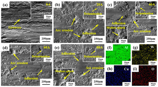 SEM images and EDS mappings of the wear surface of the Al/W composite layer under different currents: (a) 0 A; (b) 20 A; (c) 40 A; (d) 60 A; (e) 80 A; (f–i) the EDS mappings at 0 A.