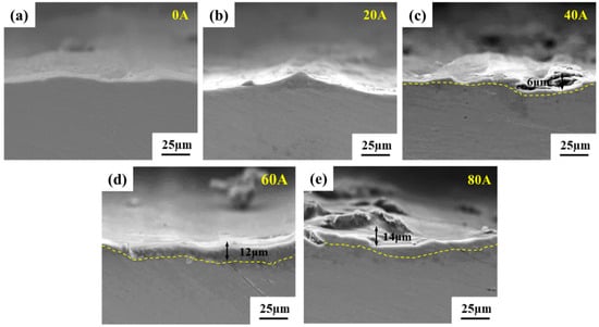 Figure 7 shows the cross-sectional morphology of the aluminum alloy substrate wear specimens under different currents. At 0 A and 20 A, no obvious changes were observed in the cross-section of the wear specimens. However, as the applied current increased, a distinct melting layer emerged at 40 A, with an estimated thickness of approximately 6 μm. Notably, with further escalation of the current, the thickness of this melting layer progressively increased, reaching approximately 14 μm at 80 A.