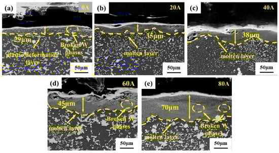 SEM images of the cross-sectional morphology of the Al/W composite layer wear specimens under different currents: (a) 0 A; (b) 20 A; (c) 40 A; (d) 60 A; (e) 80 A.