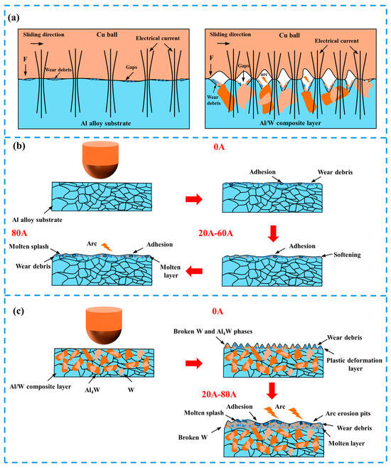 (a) Current-carrying wear contact interface; schematic diagram of wear mechanism of (b) the aluminum alloy substrate and (c) the Al/W composite layer.