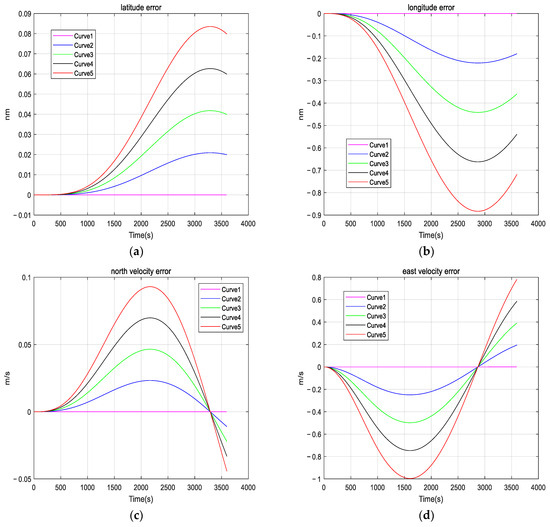 Figure 3. Navigation error under different startup drifts: (a) latitude error under different startup drifts; (b) longitude error under different startup drifts; (c) north velocity error under different startup drifts; (d) east velocity error under different startup drift; (e) roll angle error under different startup drift; (f) pitch angle error under different startup drift; and (g) heading angle error under different startup drift.