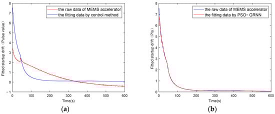 Figure 11. Accelerometer startup drift and its fitting data when starting at 50 °C: (a) fitting with the control group; (b) fitting with the proposed method.