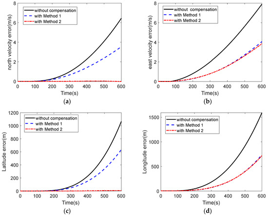 In order to verify whether this method is effective, we conducted navigation experiments; the collected raw data were compensated by the multiple regression model described in Section 4.1 (i.e., method 1 in the graph) and the method in this paper (method 2), then obtained two groups of compensated data. The experiment process of the navigation experiment is as follows: The data collected in Section 4.1 was used for navigation calculation. The navigation calculation process entailed the following: 1 min of alignment, and inertial navigation after the alignment. The total time was 10 min. We calculated the navigation results of two sets of data, and their navigation errors were compared to verify whether the compensation method was effective or not.