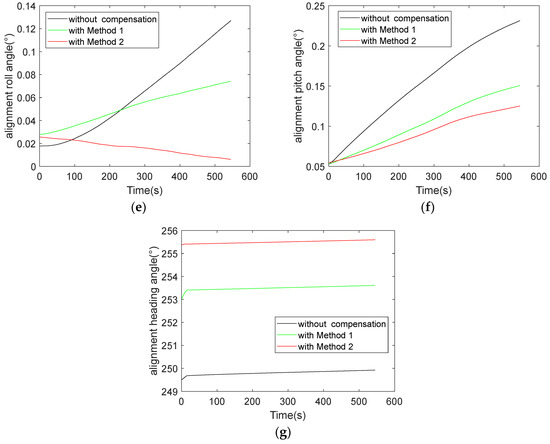 Figure 13. Navigation results at 20 °C: (a) north velocity error of the data with and without compensation; (b) east velocity error of the data with and without compensation; (c) latitude error of the data with and without compensation; (d) longitude error of the data with and without compensation; (e) alignment roll angle of the data with and without compensation; (f) alignment pitch angle of the data with and without compensation; (g) and alignment heading angle of the data with and without compensation.