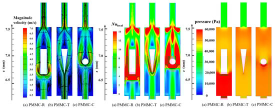 Flow field, Nulocal, and pressure field of different MCs in the y = 0.15 mm plane at Re = 500.
