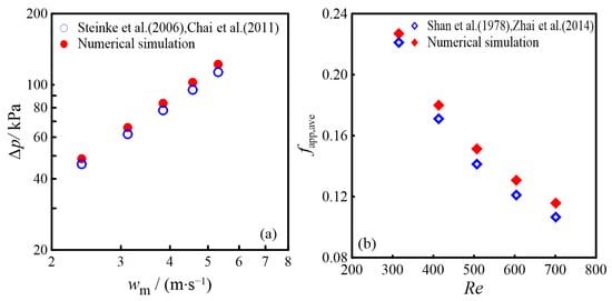 Comparative analysis of numerical and theoretical results: (a) Δp obtained by Steinke et al. [] and Chai et al. []; (b) fapp,ave obtained by Shan et al. [] and Zhai et al. [].