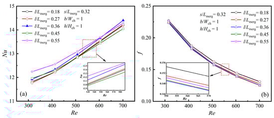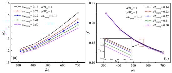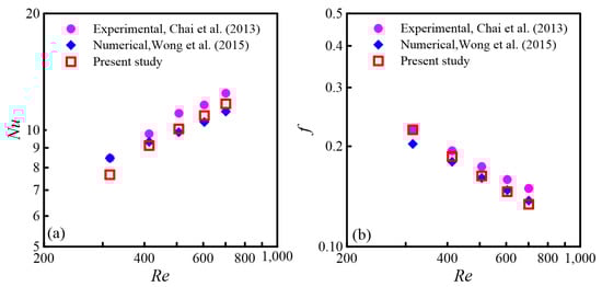 To further validate the precision of the numerical results, the same structure as the experimental model by Chai [] was used for numerical calculations. It is worth noting that Wong [] also validated the same structure through numerical simulations. Nu and f obtained from the numerical calculations were contrasted with both the experimental data and the numerical findings of Wong []. The comparison is shown in Figure 4a,b.