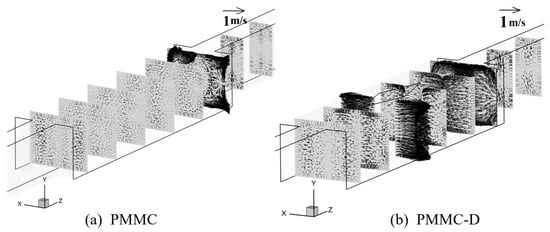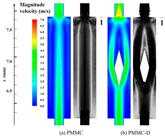 To better analyze the fluid flow in PMMC and PMMC-D, Figure 6 presents the velocity vectors of the fluid on the cross-section within the microchamber. Comparing PMMC and PMMC-D, in PMMC, vortices are only generated at the bottom of the microchamber as the fluid impacts the front wall of the chamber. In contrast, the presence of diamond-shaped ribs alters the flow direction, velocity, and vortex rotation. According to the Bernoulli effect, at the widest cross-section of the rib, the fluid velocity and longitudinal vortices are most pronounced. The diamond-shaped ribs promote efficient fluid mixing, leading to continuous boundary layer disruption and redevelopment, thereby enhancing heat transfer performance.