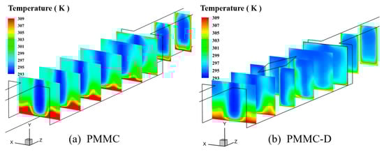 Figure 8a,b show the temperature distributions at different cross-sections within the PMMC and PMMC-D microchannels, respectively. Comparing the temperatures at different cross-sections, it is observed that in PMMC, the temperature at the fluid–solid interface is higher, and the temperature variation across the cross-section is relatively small. In contrast, in PMMC-D, after the fluid passes through the diamond-shaped ribs, the enhanced fluid mixing promotes momentum and heat exchange between the mainstream and near-wall fluids, leading to a significant decrease in temperature at the fluid–solid interface, thereby greatly enhancing the thermal performance of this heat sink.