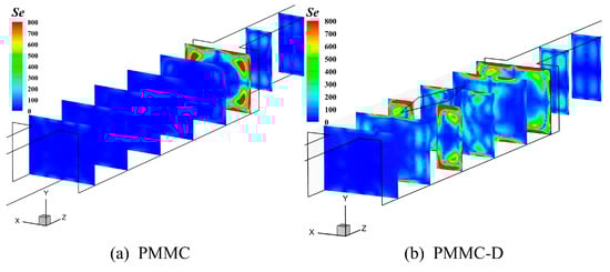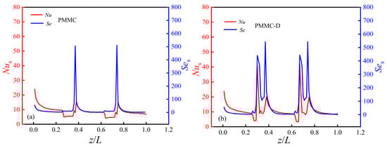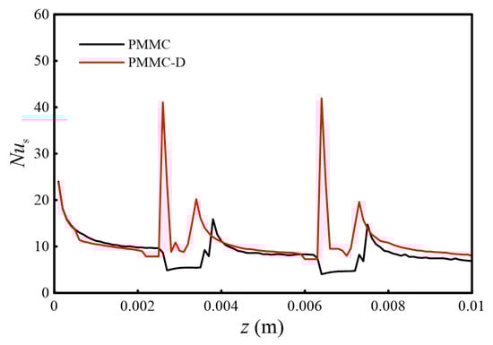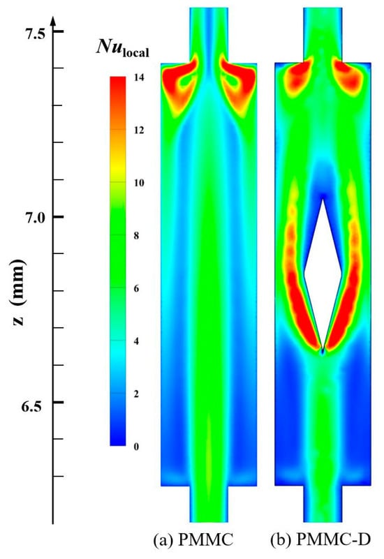 Figure 9 illustrates the Nulocal value distributions of PMMC and PMMC-D on the y = 0.15 mm plane at Re = 500. The local Nusselt number (Nulocal) is based on hlocal defined by Equation (19). Figure 9 shows the differences in heat transfer performance on the surface at different positions. In Figure 9a, the highest Nulocal values are mainly located in areas where the fluid transitions from the microchamber into the MC, causing a sudden decrease in cross-sectional area and fluid impingement on the ribs. In Figure 9b, the mainstream is interrupted by the diamond-shaped ribs, and the fluid is directed to both sides of the ribs, leading to a thinning of the thermal boundary layers on both sides and higher Nulocal values in these regions. Behind the diamond-shaped ribs, the Nulocal value decreases due to the formation of recirculation zones. Additionally, before the fluid continues to flow from the merged microchamber into the MC, the cross-sectional area suddenly decreases, causing the fluid to impinge on the ribs between adjacent channels. The fluid is diverted to both sides, and its velocity increases, resulting in a higher intensity of Nulocal in these regions.