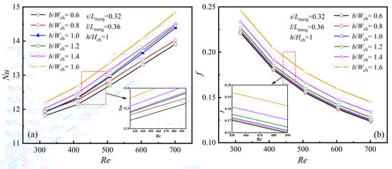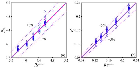 Analysis of numerical calculations [] and experimental findings []: (a) Nu; (b) f.