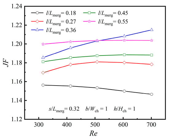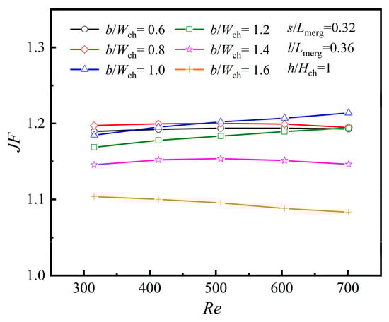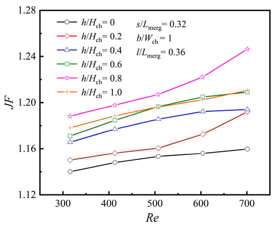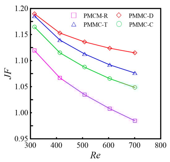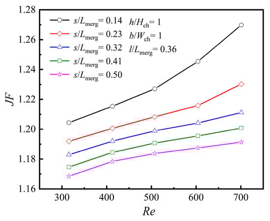 With the same mass flow rate constraint, the heat transfer enhancement factor (JF) is described as the ratio between the average Nu of the merged chamber microchannel (MC) featuring various rib structures and the average Nu0 of the PMMC. It is formulated as follows: