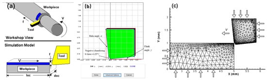 A finite element analysis model was established using AdvantEdge software (v7.1-002), as displayed in Figure 3a. In this program, the cutting length is denoted as loc, and the cutting depth is represented by f, which is the actual feed rate during cutting. The cutting width is expressed as doc, which is the actual cutting depth during the cutting process, and the cutting speed is expressed as vc (m/min). The built-in tool geometry editor constructed a negative chamfered structure of the tool with fixed constraints applied to the upper and right ends, as shown in Figure 3b. CBN was used as the cutting tool material.