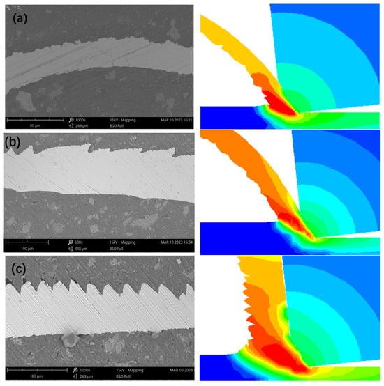 In Figure 6a,b, it can be observed that the chip morphologies obtained from both the experiments and finite element simulations are very similar and show lamellar ribbons, and the free surfaces exhibit a certain amount of concavity and convexity. The lamellar cutting interval in Figure 6b is slightly larger than that in Figure 6a and has a somewhat serrated shape. Figure 6c shows that the simulated and experimental chips evolve into smaller serrated shapes at higher cutting speeds, which further demonstrates the reliability of the obtained JC constitutive model parameters. The established finite element simulation model is reasonable and can be applied to the analysis of the Vit1 cutting process and chip formation mechanism. The chip morphology simulation reveals that at lower cutting speeds, chips are pushed out along the negative chamfer of the tool, which facilitates chip removal from the machined surface. However, at higher cutting speeds, the chips flow over the negative chamfer and discharge along the rake face. This suggests a rougher non-free surface of the chip at higher cutting speeds. Additionally, a metal dead zone exists before the negative chamfer of the tool, effectively squeezing the chips.