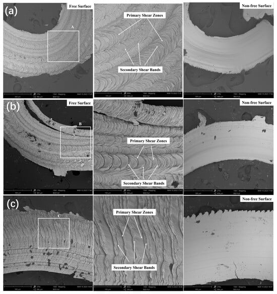The main vein patterns of the chips are separated under different feed conditions, as illustrated in Figure 7a,b. This is because of the low cutting speed, which causes slower extrusion and severe material accumulation, resulting in the formation of such veins. As the feed rate increases, the chips are easily torn along the main vein. In contrast, a lower feed rate results in more delicate, fish-scale-shaped chips. In Figure 7a, it is impossible to distinguish between the primary and secondary shear bands, which indicates a ribbon-like chip morphology. From Figure 7b, it can be observed that the distance between the fish-scale-like slices increases, and the primary and secondary shear bands are already well distinguished, indicating that the chip morphology tends to change towards a serrated shape. In Figure 7c, the fish-scale-like slices disappear, presenting an overall thin slice-like primary shear band. These fractures form by the direct plastic deformation expansion between the cutting layer material and uncut layer material, which is the chip serrated unit in Figure 6. After fracture, the cutting layer material is squeezed and pushed away from the workpiece by the tool. A portion of the material being pushed away undergoes a small displacement relative to the microcracks, forming and stacking many small folds on the cracks, called secondary shear bands.