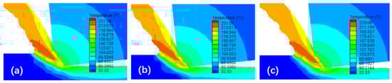 Simulated temperature distribution during chip formation. (a) t1 = 0.0053 s; (b) t2 = 0.0056 s; (c) t3 = 0.0059 s.