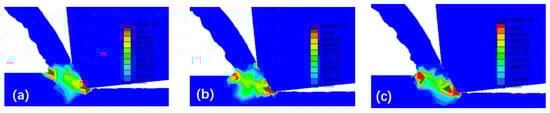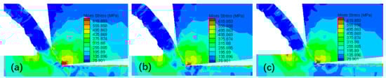 Simulated stress distribution during chip formation. (a) t1 = 0.0053 s; (b) t2 = 0.0056 s; (c) t3 = 0.0059 s.