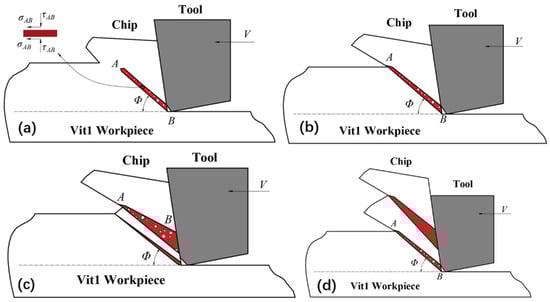 To study the cutting mechanisms of metal using finite element analysis, establishing a mechanical analysis model is essential. Most of the current research has focused on calculating shear angles to solve theoretical cutting force models, such as the shear angle calculation method proposed by Merchant [], slip-line field theory proposed by Lee and Shaffer [,], and parallel surface shear region theory proposed by Oxley [].