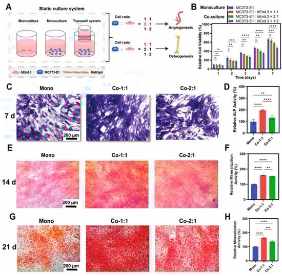 To investigate the effects of osteoblast–endothelial cell interactions mediated by paracrine mechanisms under co-culture at different cell ratios, we established an indirect co-culture system of MC3T3-E1 and bEnd.3 cells using Transwell inserts (Figure 1A). First, cell viability assays were performed to evaluate the effect of bEnd.3 cells on the proliferation of MC3T3-E1 cells in co-culture groups with different cell ratios. CCK-8 assays showed that there was a temporal increase in the MC3T3-E1 viability in all the groups, with no significant differences observed between the monoculture group and the ratio of 1:1 co-culture group of MC3T3-E1 and bEnd.3 cells in terms of survival over a 7-day period (Figure 1B). Notably, the ratio of the 2:1 (MC3T3-E1:bEnd.3) co-culture group showed a marginal reduction in viability (13 ± 2%), while the ratio of the 1:2 (MC3T3-E1:bEnd.3) co-culture group showed a more pronounced inhibition (29 ± 2%). Meanwhile, a ratio of 1:1 mixed medium of MC3T3-E1 and bEnd.3 cell media was used to culture MC3T3-E1 cells, and the results showed that this ratio of mixed medium had a negligible effect on the proliferation of MC3T3-E1 cells (Figure S3A). The results indicated that co-culture with bEnd.3 cells did not promote the proliferation of MC3T3-E1 cells. This may be due to the competition for nutrients with bEnd.3 cells under co-culture conditions. Based on these results, subsequent experiments focused on the 1:1 and 2:1 (MC3T3-E1:bEnd.3) co-culture groups.