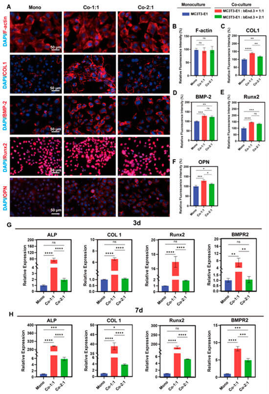 Expression of osteogenic markers in MC3T3-E1 and bEnd.3 cells co-cultured at different cell ratios. (A) Filamentous actin (F-actin) staining and immunofluorescence staining of COL1, BMP-2, Runx2 and OPN in MC3T3-E1 after 3 days of co-culture. (B–F) Quantitative results of F-actin, COL1, BMP-2, Runx2 and OPN expression, respectively. (G) Expression levels of osteogenesis-related genes ALP, COL1, Runx2, BMPR2 after 3 days of co-culture. (H) Expression levels of osteogenesis-related genes ALP, COL1, Runx2, BMPR2 after 7 days of co-culture. Mono: monoculture, Co-1:1: MC3T3-E1:bEnd.3 = 1:1, Co-2:1: MC3T3-E1:bEnd.3 = 2:1. * p < 0.05, ** p < 0.01, *** p < 0.001, **** p < 0.0001, ns. not significant. n ≥ 3, the n represents the number of independent samples.