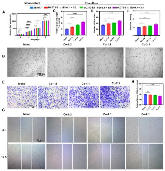 To evaluate the effect of MC3T3-E1 cells on the angiogenesis of bEnd.3 cells in co-culture groups with different cell ratios, angiogenesis-related experiments were performed. The CCK-8 assay showed that all the co-culture groups promoted the proliferation of bEnd.3 cells compared to the monoculture group on days 3, 5, and 7 (Figure 3A), and the promotion effect increased with the decrease of the proportion of bEnd.3 cells in the co-culture groups, which were MC3T3-E1:bEnd.3 = 1:2 (67%), 1:1 (50%), 2:1 (33%), respectively. The best effect was obtained in the 2:1 co-culture group. Meanwhile, a ratio of 2:1 mixed medium of MC3T3-E1 and bEnd.3 cell media was used to culture bEnd.3 cells, and the results showed that this ratio of mixed medium had a negligible effect on the proliferation of bEnd.3 cells (Figure S3B). Compared to the monoculture group, co-culture with different cell ratios promoted the bEnd.3 cells to form more capillary-like structures (Figure 3B), which manifested as an increase in the branch length and branch number (Figure 3C,D), and the promotion effect was negatively correlated with the percentage of bEnd.3 cells, and the best effect was seen in the 2:1 co-culture group. In addition, the Transwell inserts migration assay showed that co-culture could promote the migration of bEnd.3 cells, and the promotion effect was negatively correlated with the percentage of bEnd.3 cells, and the best effect was observed in the 2:1 co-culture group (Figure 3E,F). The scratch wound assay further confirmed this result (Figure 3G,H), but the 1:2 co-culture group was not significantly different from the monoculture. This result demonstrated that osteoblasts positively regulate endothelial cell migration and angiogenesis, which is consistent with previous reports [7,13,37]. Therefore, the 1:1 and 2:1 co-culture groups were selected for subsequent experiments. These results suggest that a 2:1 co-culture of MC3T3-E1 and bEnd.3 cells was more favorable for angiogenesis.