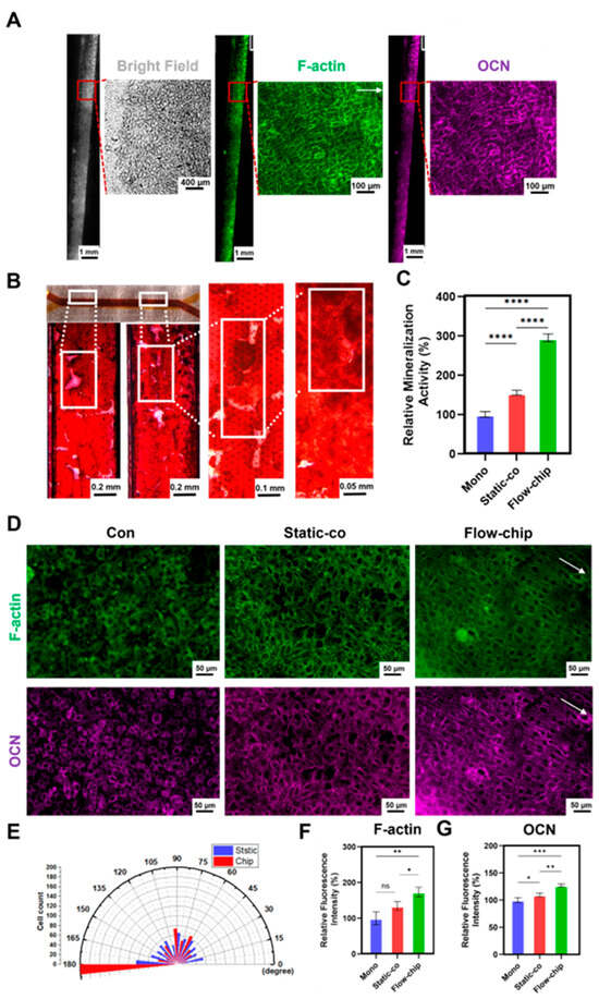 To demonstrate that the chip can perfuse cells at a microfluidic rate of 10 µL/min for a long period of time, we recorded the growth state of the MC3T3-E1 cells within the chip using a microscope. Brightfield images of the MC3T3-E1 cells at different time points showed that the cells remained morphologically normal throughout the 14 days of culture on the chip (Figure S5). In addition, we demonstrated the effects on the growth status and mineralized matrix formation of the MC3T3-E1 cells after 14 days of culture on the chip by immunofluorescence and ARS staining. Brightfield images showed that the MC3T3-E1 cells grew vigorously, completely occupying the channel membrane and surrounding the channel wall. In addition, intra-channel F-actin and osteocalcin (OCN) staining showed that the MC3T3-E1 cells exhibited directional growth (fluid direction, 180°) and effective differentiation upon microfluidic stimulation on the chip (Figure 6A). ARS staining showed a large number of calcium nodules (Figure 6B), and the quantitative results showed that the formation of calcium nodules on the chip was 1.90 times higher than that of the static co-culture (Figure 6C). This result indicates that the chip promoted osteogenic mineralization of co-cultured MC3T3-E1 cells. Meanwhile, we hypothesized that mechanical stimulation could affect mineralization by inducing cytoskeletal rearrangements of the osteoblasts [41]. To further illustrate the effect of the microfluidic chip on MC3T3-E1 osteogenic differentiation, we performed immunofluorescence staining of the MC3T3-E1 cells in different models. F-actin and OCN staining (Figure 6D) showed that the cytoskeleton of the MC3T3-E1 cells was significantly oriented along the microfluidic direction (180°), up to more than 75% after 3 days of co-culture on the chip (Figure 6E). The quantitative results showed that the expression of F-actin and OCN on the chip was 1.29 times (Figure 6F) and 1.27 times (Figure 6G) higher than that of the static co-culture, respectively. This result indicates that the microfluidic chip promoted the directional stretching of the MC3T3-E1 cytoskeleton and the expression of osteogenic markers. In a word, these results confirm that the microfluidic chip enhanced the osteogenic effect of osteogenesis–angiogenesis.