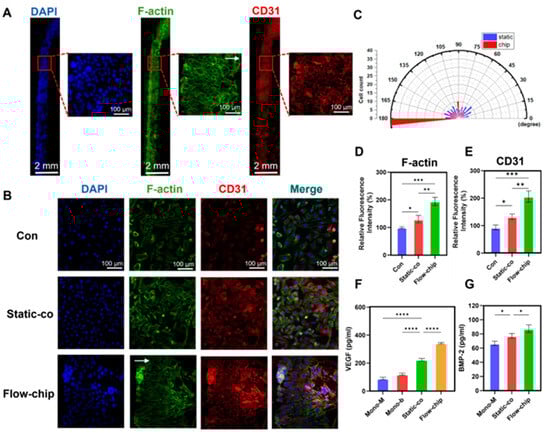 To demonstrate that the chip can perfuse cells at a microfluidic rate of 10 µL/min for a long period of time, we recorded the growth state of the bEnd.3 cells within the chip using a microscope. The brightfield images of the bEnd.3 cells cultured on the chip showed that the cells remained morphologically normal for 14 days (Figure S5). In addition, we demonstrated the effects on the bEnd.3 cell growth status and angiogenesis by immunofluorescence staining after 14 days of culture on the chip. Nuclear staining showed that the bEnd.3 cells grew vigorously, occupying the channel membrane and surrounding the channel wall (Figure 7A). F-actin and CD31 staining showed that the bEnd.3 cells grew directionally (fluid direction, 180°) in response to microfluidic stimulation, resulting in the formation of a functional endothelial layer. It was suggested that shear stress drives the rearrangement of the bEnd.3 cytoskeleton, presumably affecting angiogenesis [41]. To further illustrate the effect of microfluidic chips on bEnd.3 cell angiogenesis, we performed immunofluorescence staining of the bEnd.3 cells in different models. After 3 days of co-culture, F-actin and CD31 staining of the bEnd.3 cells (Figure 7B) showed that the bEnd.3 cells were highly aligned along the microfluidic direction, up to more than 75% (Figure 7C). The quantitative results showed that the expression of F-actin and CD31 on the chip was 1.49 times and 1.55 times higher than that of the static co-culture, respectively (Figure 7D,E). These results suggest that the chips enhanced the angiogenic effect of osteogenesis–angiogenesis.