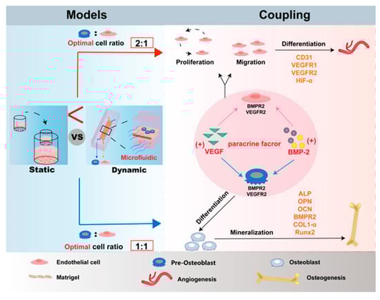 Furthermore, this osteogenesis–angiogenesis coupling is not only mediated by the paracrine mechanisms but also modulated by mechanical stimuli in the physiological microenvironment [23]. Endothelial cells (ECs) regulate and remodel the vasculature in response to hemodynamic forces [24], and MSCs accelerate osteogenic differentiation under low levels of shear stress [25,26]. Therefore, it is necessary to introduce mechanical cues to reproduce the dynamic microenvironment of osteogenesis–angiogenesis coupling to improve the physiological relevance. A dynamic model that can provide mechanical stimulation is critical to the study of osteogenesis–angiogenesis coupling. However, animal models as a traditional dynamic research model have long lead times, high costs and ethical issues [27,28]. Therefore, a new dynamic culture model is needed. Organ-on-a-chip offers a promising solution that integrates microfluidics, 3D biomaterials, cell biology, and tunable mechanical cues [29,30]. The chip systems mimic the physiological microenvironment relevant to the human body in terms of the tissue interfaces and mechanical stimuli [31], and they allow precise control of multicellular interactions in this environment to study the kinetics of in vitro drug activity and systemic responses [32]. However, the use of organ-on-a-chip models to investigate the potential for osteogenesis–angiogenesis coupling under combined paracrine regulation and microfluidic modulation has not been studied.
