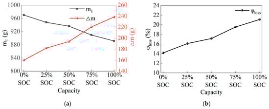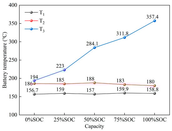 - The valve opening temperature T1 during battery thermal runaway remained in the range of 156.7 °C to 159.9 °C across different SOC levels, with minimal fluctuation. This indicates no significant correlation between T1 and SOC. The rapid self-heating onset temperature T2 during thermal runaway was between 180 °C and 186 °C across all SOCs, with little temperature variation, suggesting no significant correlation between T2 and SOC. The maximum temperature T3 during thermal runaway was positively correlated with SOC, meaning that as SOC increases, T3 increases, reaching a maximum of 357.4 °C. A higher SOC leads to a larger internal short-circuit current, higher temperatures, and more intense thermal runaway reactions and eruptions. The side reactions between the anode and cathode materials and the electrolyte generate more gas and electrolyte vapor, which are expelled in greater quantities, resulting in an increased mass loss rate with the increase in SOC. The experiments show that the mass loss rate during thermal runaway triggered by stepwise heating in a 50 Ah LiFePO4 battery is around 14% to 21%.