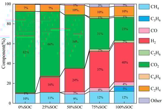 - As SOC increased, the amount of CO2 produced varied little across different SOCs, indicating that the side reaction producing CO2 is independent of SOC. However, the amount of H2 produced increased sharply: 0.01 mol (0% SOC), 0.13 mol (25% SOC), 0.21 mol (50% SOC), 0.43 mol (75% SOC), and 0.93 mol (100% SOC). As the thermal runaway temperature increased, hydrogen production from electrolyte decomposition and binder reactions became dominant among the side reactions. The amounts of CH4 and C2H4 produced gradually increased, suggesting that the side reactions producing these gases were relatively mild, with minimal influence from thermal runaway temperature. Other flammable gases showed little change in production with varying SOC.