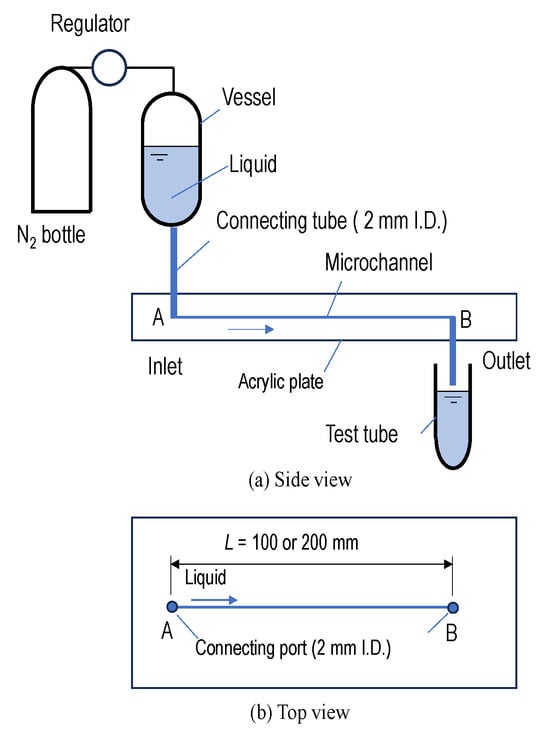 Figure 1 shows a schematic diagram of the test apparatus. The test microchannel is fabricated by two acrylic plates. The flow channel is created by overlapping a grooved plate with another flat one. The cross-sectional geometry of the channel is a square with one side of 0.5 mm. The test liquid is stored in a vessel. The liquid is supplied from port A and flowed through the microchannel. The volume flow rate of the liquid supplied is adjusted by regulating the pressure of nitrogen in the vessel as shown in Figure 1a. The liquids are discharged into the atmosphere from port B and are collected into a test tube. The rheological properties of the collected liquids are measured with the method described in Section 2.3. In order to avoid unnecessary mechanical degradation of the liquids before entering the microchannels as much as possible, the pipes before entering the microchannels are made of 2.0 mm (inner diameter) plastic tubing with a length of 100 mm.