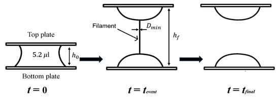 An extensional elasto-capillary thinning measurement method is used to measure relaxation time for evaluating the extensional rheological properties [,]. As shown in Figure 2, a small quantity of the test liquid sample (5.2 μL) is placed between two plastic plates made of polycarbonate. The initial separation height which is between two plates, , is set to be 1.22 mm (t = 0). The liquid confined between the two plates is stretched as the top plate is moved linearly to a final height = 2.44 mm. As shown in Figure 2, a cylindrical liquid filament is formed between two plates, and the diameter of the filament, [m], becomes thinned exponentially in time, and the filament eventually breaks (t = ). During the thinning process of the filament, the minimum diameter of the filament is recorded by a high-speed video camera (MEMRECAM HX-3, Nac Image Technology Inc., Tokyo, Japan) under 2000 FPS.