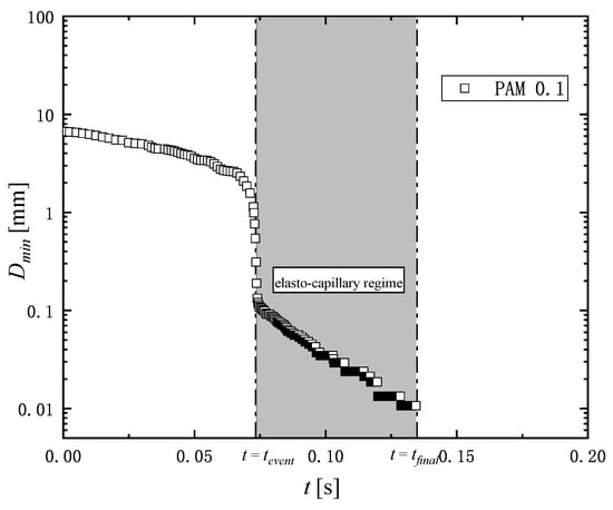 Figure 3 shows an example of the measurement of the change in diameter of a liquid filament over time. The thinning dynamics of the filament is driven by capillary forces. The capillary thinning is resisted by a combination of the viscosity, inertia, and elasticity of liquids, which depends on the liquid’s physical properties. The competition among the inertia, viscosity, and elasticity during the filament thinning process gives rise to three distinct filament breakup regimes known as the inertia-capillary, the visco-capillary, and the elasto-capillary regime [,]. In the elasto-capillary regime over to as shown in Figure 3, the filament is in an elasto-capillary equilibrium and continues to thin due to capillary forces until the filament breaks at .