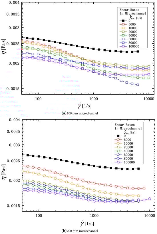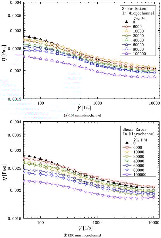 Effects of the shear rate in microchannel , and the channel length on the viscosity profile of the PAM 0.3 solution: (a) 100 mm microchannel; (b) 200 mm microchannel.