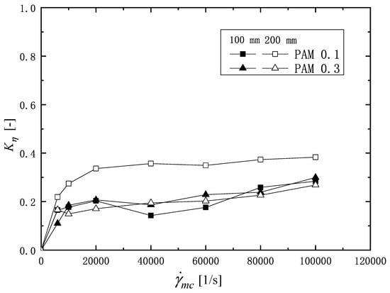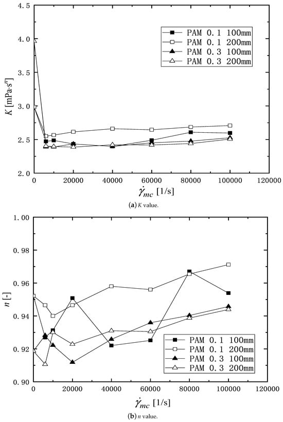 In Equation (6), K [Pa· ] is the pseudo-plastic viscosity, n [-] is the flow behavior index, and [1/s] is the shear rate in rheometer. Table 1 shows the values of K and n obtained from the viscosity profile data in Figure 4 and Figure 5. Figure 6a,b show the K and n values plotted against the shear rate, . The K values of the PAM solution after passing through the channel are smaller than the value at and are almost constant against the shear rate, . Although there is some scatter, the value of n tends to increase with the increasing of , indicating that the pseudo-plasticity decreases.