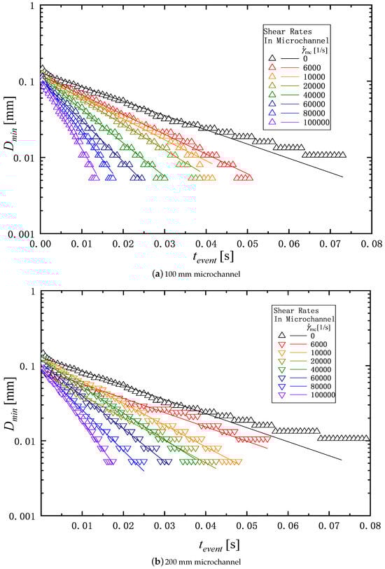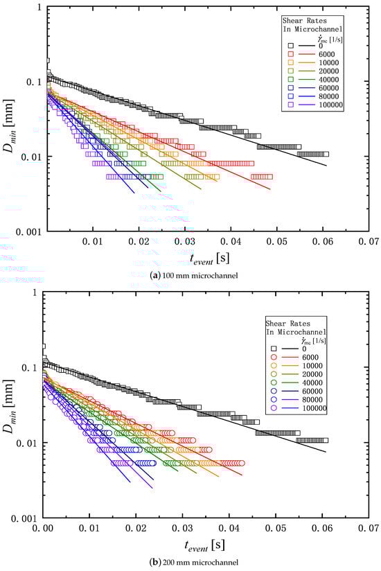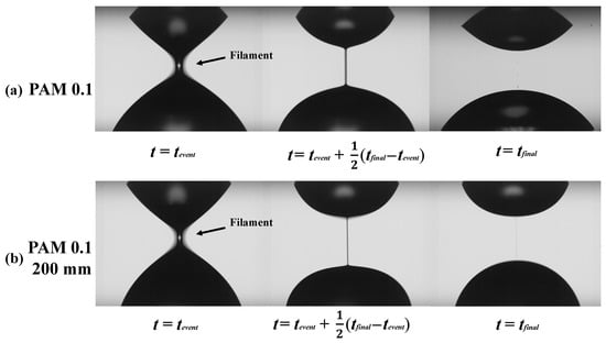 Figure 8a,b show the typical example of the filament thinning behavior of PAM 0.1 wt% solution in the extensional measurement described in Section 2.3. Figure 8a shows the behavior of the solution before passing through the microchannel, and Figure 8b shows the behavior of the solution passed through the microchannel with the length of 200 mm. As shown in Figure 3, means the start time of the elasto-capillary process, and the time at which the filament breaks. The duration of the elasto-capillary process, i.e., , for and 1/s are 64 ms and 19 ms respectively. Thus, the elasto-capillary process time becomes shorter after passing through the microchannel.