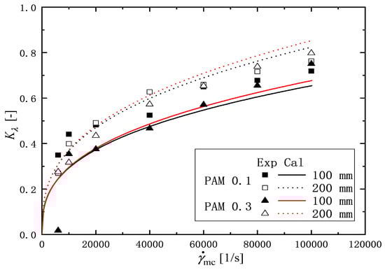 Here, [s] is the relaxation time of the solutions after degradation with various shear rates in microchannel 1/s, [s] is the relaxation time of the original ones without flow in the channel . Figure 12 shows the variation of the elastical degradation ratio , with the shear rate in the microchannel . Two symbols represent the experimental values of , and two curves indicate the calculation mentioned in Section 3.3. For the solutions of PAM, the value of increases with increasing the shear rate. In the shear rate range ( 1/s), the value of increases rapidly with the shear rate. Beyond the shear rate range, the value of the ratio increases slowly with an increasing shear rate. Focusing on the effect of channel length on the relaxation ratio, it can be seen that the value of for 200 mm long is greater than that of the 100 mm one. As mentioned in the introduction, factors that affect the change in the rheological properties of a solution before and after it is passed through a microchannel include the shape of the inlet and outlet of the channel (contraction and/or expansion), the length of the channel, etc. Meanwhile, in this experiment, the length of the channel is changed, but the shape of the inlet and outlet is the same, so it is assumed that the difference in the observed relaxation between 100 mm and 200 mm long channel under the same shear rate is due to the difference in the length of the channel.