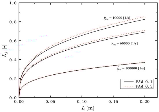Figure 13 shows the ratio of change in the relaxation time , calculated with Equation (11) under three constant shear rate conditions = 10,000, 60,000 and 100,000 1/s. The solid and broken lines express the calculations for PAM 0.1 and PAM 0.3 solutions, respectively. The calculated values of increased with the increasing of both the channel length L and the shear rate in the microchannel . Even without using a relaxation time measuring device, Equation (11) is useful for easily estimating the change in relaxation time when a PAM aqueous solution is flowed through a microchannel.