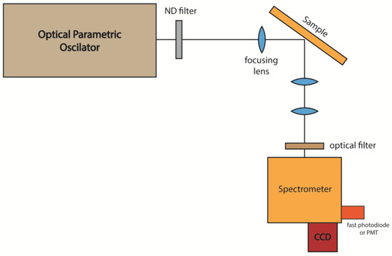 The optical characterization of the samples was conducted to evaluate their potential for RL operation. The excitation source consisted of a pulsed Optical Parametric Oscillator (OPO), delivering (pulses of ~7 ns) at tunable wavelengths, selected according to the absorption characteristics of the REI under investigation. The excitation wavelength was adjusted based on the dopant (e.g., Nd³⁺ or Er³⁺/Yb³⁺) and the specific emission transition being studied. The light emitted from the samples was directed to a high-resolution spectrometer that could be externally triggered, enabling the acquisition of emission spectra corresponding to individual excitation pulses. A typical experimental setup is illustrated in Figure 1.