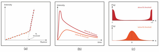 The emission spectra were recorded as a function of the excitation pulse energy to evaluate the presence of stimulated emission and to determine the RL threshold. RLs based on glasses are not expected to present large narrowing of the emission line above the laser threshold as in RLs based on crystalline media because the optical transitions of the embedded laser-active ions are always affected by inhomogeneous broadening [34,35]. This is a result of the complex structure of the glassy hosts, where active ions may occupy several distinct sites with dissimilar chemical environments, resulting in many possible lasing modes. For this reason, even conventional lasers based on non-crystalline hosts may present wider emission bandwidths ( when compared to crystalline hosts (. Nevertheless, the RLs based on glasses still present a nonlinear input–output curve characterized by a laser threshold, and the photoluminescence (PL) dynamics are modified above the laser threshold.