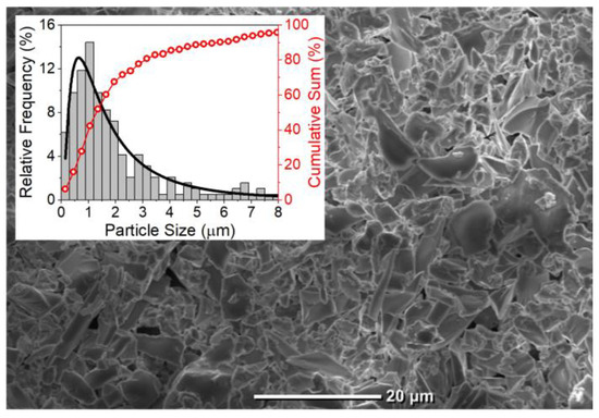 SEM image of the milled Nd3+-doped TZO glass. The inset shows the histogram of the size distribution of the particles fitted with a log-normal curve (in black) and the percentage of cumulative sum of sizes (in red).