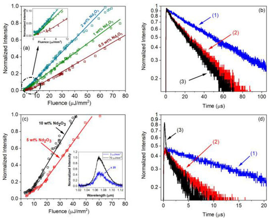 Figure 5a,b show a clear threshold that coincided to within 15% with the change in slope of the rise time measurements. For the lowest Nd2O3 concentration (4 wt.%), the highest threshold was observed at (1.4 ± 0.4) mJ/mm2, whereas the sample with 16 wt.% Nd2O3 demonstrated the smallest threshold (0.81 ± 0.10) mJ/mm2.